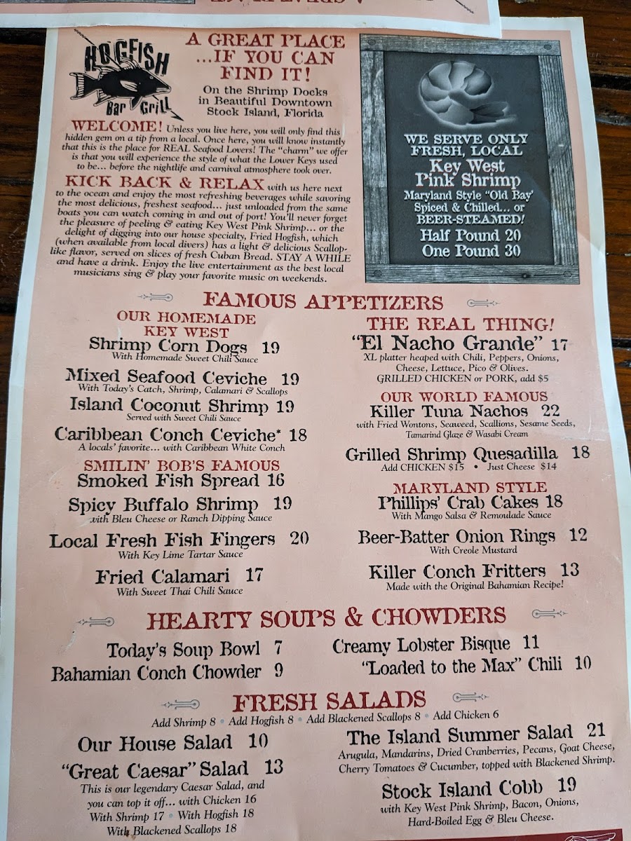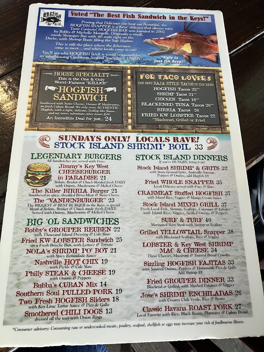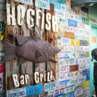 “ So on a recommendation we went in search of Hogfish Bar & Grill. It took a Google Maps search to find it, but we did. It was worth the search. We began with their Lobster Bisque. It was the best we have had... maybe ever. Full of lobster pieces and chunks, a mild favor of dry sherry, and not over powered by tomato paste. It was absolutely delightful. We, my lovely wife and I highly recommend it. And the bowl is enough for a couple to share as an appetizer or to feed a hungry sailor. Next, my wife chose the shrimp and chips basket. It came with only 6 shrimp, but they were not just large, but really big. A light crispy fried coating. The shrimp were plump and juicy. Perfectly cooked with a basket of fries, a cup of slaw and cocktail sauce. The shrimp were fresh and delicious. And the six were enough for a meal. The fries were crispy and the slaw were good. But the shrimp was amazingly delicious. I chose the special; the whole Florida Lobster stuffed with Lump Crab Meat. It was served with rice, a cream sauce for the rice, and the chef's steamed vegetables. This was beyond delicious. It was probably a 1 or 2 lb spiny lobster, cooked perfectly and stuffed with lump crab meat with out peppers, onions, unnecessary breadcrumbs, but hust lots of crab with some butter and a little Panco and nothing else. It was unforgettable. Served with melted butter which it really didn't need. The lobster was sweet and naturally buttery. Cooked perfectly. The rice with cream sauce was a perfect compliment with the steam veggies. We chose to eat by the water on the deck, which only added to the ambiance. This place, this food is worth the search. We have eaten in many of the Keys eateries, but Hogfish is the best. ”